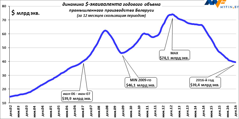Исходя из последних данных Белстата, годовой (за 12 последних месяцев, декабрь 2015-го – ноябрь 2016-го) объем промышленного производства Беларуси составил в текущих ценах Br77,788 млрд. В рублях это исторически максимальное значение, но в долларовом эквиваленте ($39,7 млрд) сегодняшний объем производства соответствует уровню 2007 года, и даже меньше: в календарном 2007-м выпущено промышленной продукции и услуг на сумму, эквивалентную $45 млрд, а меньше $40 млрд последний раз было в 12-месячный период июль 2006-го – июль 2007-го.