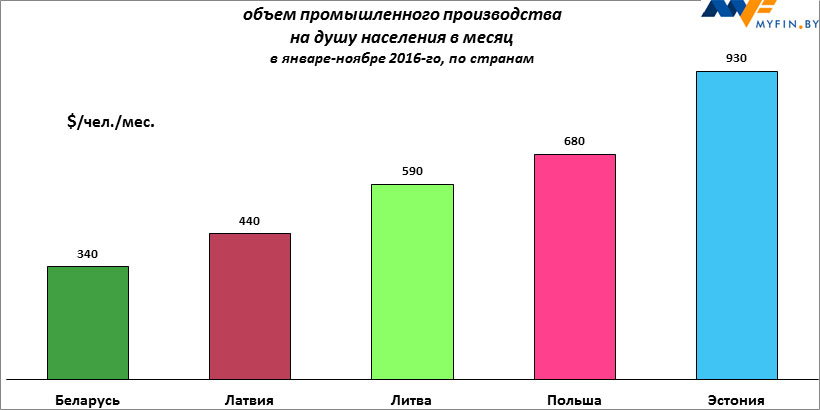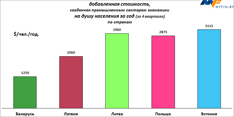 Учитывая численность населения, промышленность Беларуси создает самую маленькую, номинально, добавленную стоимость на душу населения среди этих стран.
