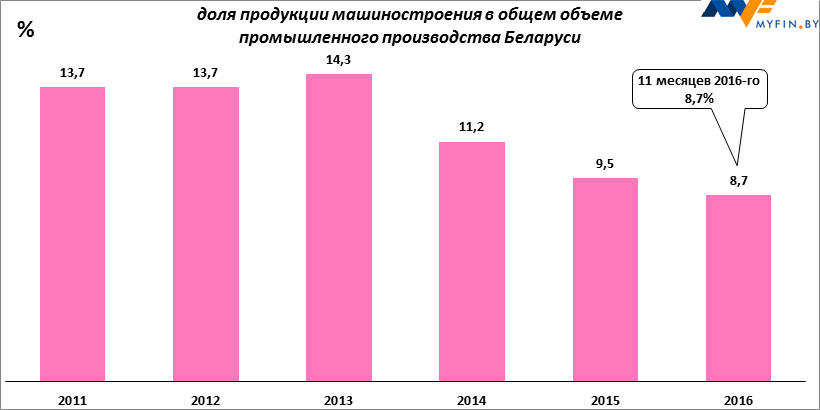 Однако доля машиностроения, на самом деле, в общем объеме промышленного производства в стране очень даже невелика: на данный момент, за январь-ноябрь 2016-го, – 8,7%. А учитывая, что продукция таких белорусских гигантов, как МТЗ, МАЗ, БелАЗ, ММЗ, «Амкодор», «Гомсельмаш» и прочих, вместе взятых – это всего лишь какая-то часть всей машиностроительной отрасли, то получается, что удельный вес продукции этих «брендов» в белорусской промышленности – не более 4-5%, и они, действительно, лишь только «бренды».