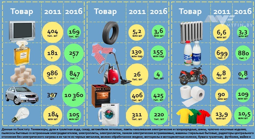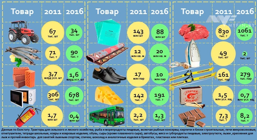 Myfin.by решил посмотреть, каких изделий спустя 5 лет в Беларуси стали производить больше, а каких меньше. И выбрали заинтересовавшие нас позиции из большого перечня.