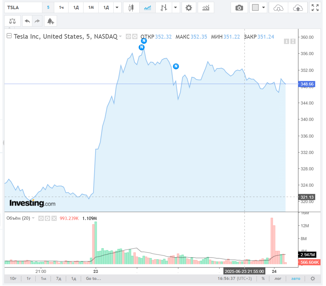 На этих новостях акции Tesla подскочили на 11% на торгах в понедельник, а затем закрылись ростом на 8% до $348,68, сократив свои потери с начала года до чуть менее 7%.