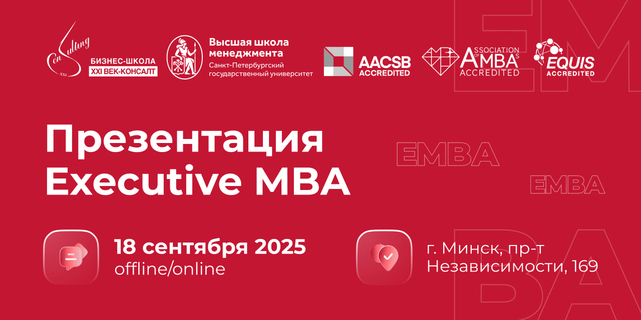 Приглашаем первых лиц компаний и членов их команд на презентацию совместной программы Executive MBAБИЗНЕС-ШКОЛЫ XXI ВЕК-КОНСАЛТ и Высшей школы менеджмента СПбГУ. Мероприятие состоится 18 сентября 2025 года в 18:00 по адресу: г. Минск, пр. Независимости, 169 (БЦ «XXI век»), 8 этаж. Вы сможете подробнее познакомиться с содержанием программы, преподавательским составом, узнать об условиях поступления и возможностях, которые открывает обучение.