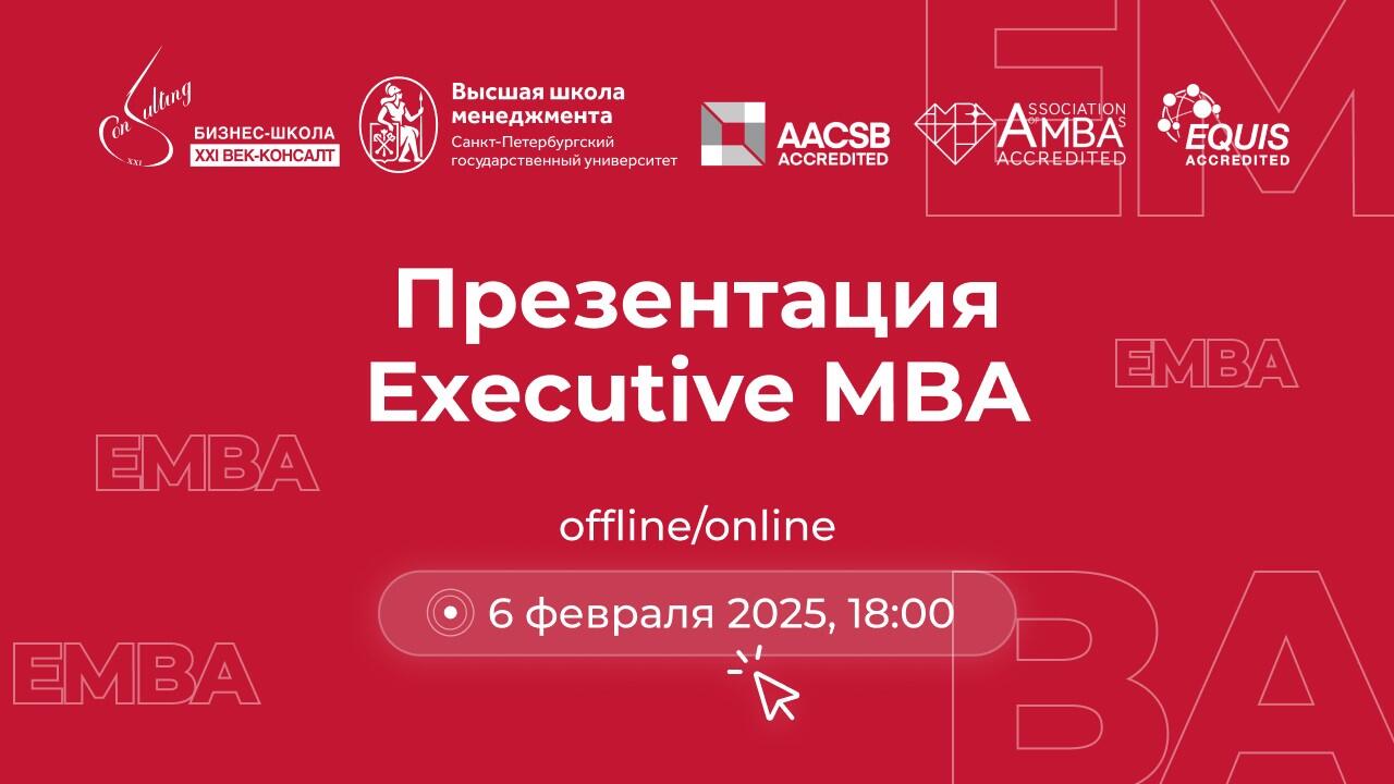 Миссия программы – развивать лидеров, желающих создавать и масштабировать организации с международным уровнем конкурентоспособности. Слушателям, успешно завершившим обучение, выдается диплом Executive MBA Санкт-Петербургского государственного университета с тремя самыми престижными в мире аккредитациями AACSB, AMBA, EQUIS. Диплом имеет международное признание.