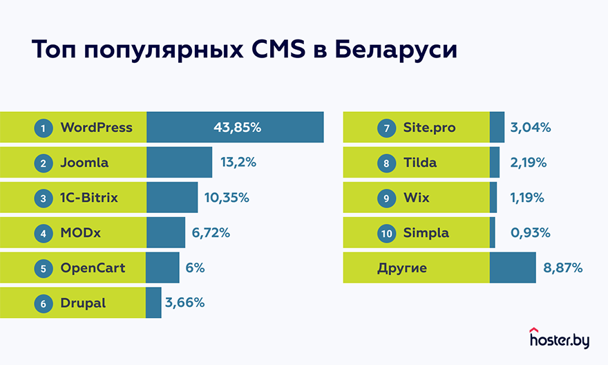 Примечательно, что доля WordPress в Беларуси в точности совпадает с мировой статистикой и уже не первый год составляет около 40%. Правда на этом сходства заканчиваются.