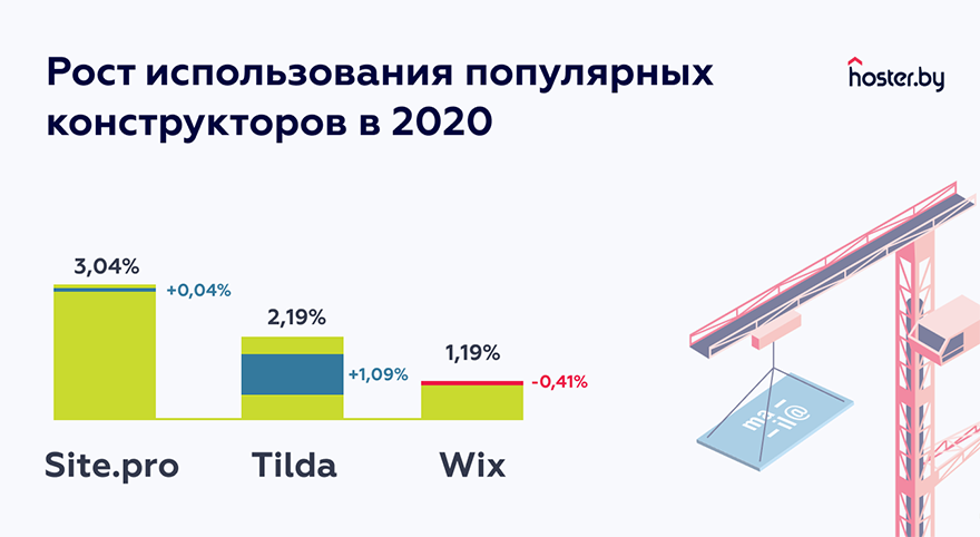 Сразу за Site.pro следует набирающая популярность в Беларуси Tilda. За год сайтов на этом конструкторе стало в 2 раза больше. А вот Wix теряет и без того скромную долю.