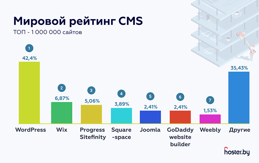 В общемировой статистике картина принципиально иная: 2 и 3 место делят конструкторы сайтов Wix и Squarespace. Их особенность в том, что создать на них сайт может любой желающий: самостоятельно, без знаний в области программирования и верстки. Кстати, WordPress также идет в сторону упрощения инструментов. Существует не один десяток плагинов, которые позволяет собрать сайт самому через простой интерфейс с «перетаскиванием» нужных графических элементов, при этом используя популярнейшую CMS с открытым исходным кодом.