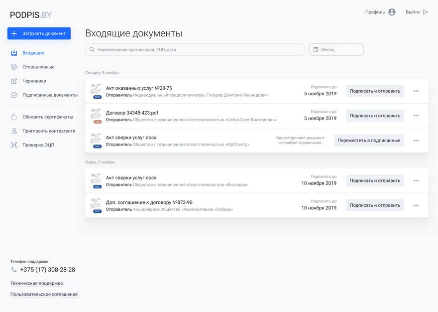 Если бизнес является клиентом podpis.by – придет уведомление о поступлении документа на электронную почту. Если нет – необходимо пригласить контрагента пройти регистрацию на сервисе и начать обмен документами.