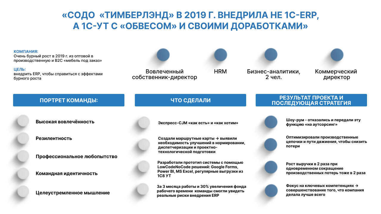 Владимир Дубатовка подкрепил теорию кейсом мебельной компании, которая в 2019 году переживала очень быстрый рост: сначала это была торговая оптовая компания в мебельной отрасли. Потом она организовала собственное производство, затем – шоурум для работы в сегменте B2C. Эти три площадки находились в разных частях города. Постепенно из-за быстрого роста вырисовалась проблема – проекты стали теряться, запаздывать, начались внутренние конфликты, отток персонала, стали непропорционально увеличиваться затраты. Вроде бы ERP должно было помочь.