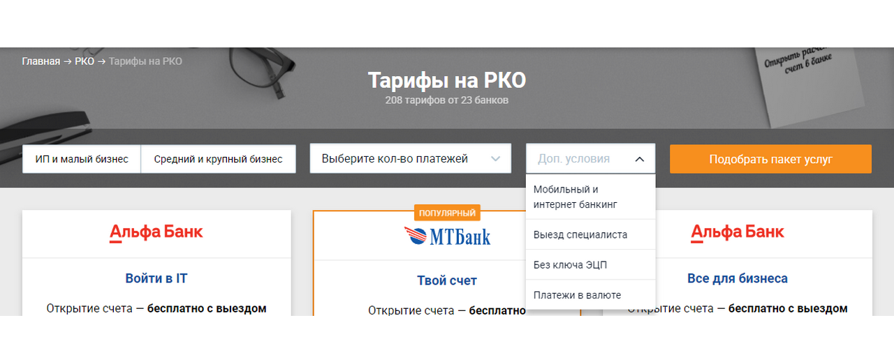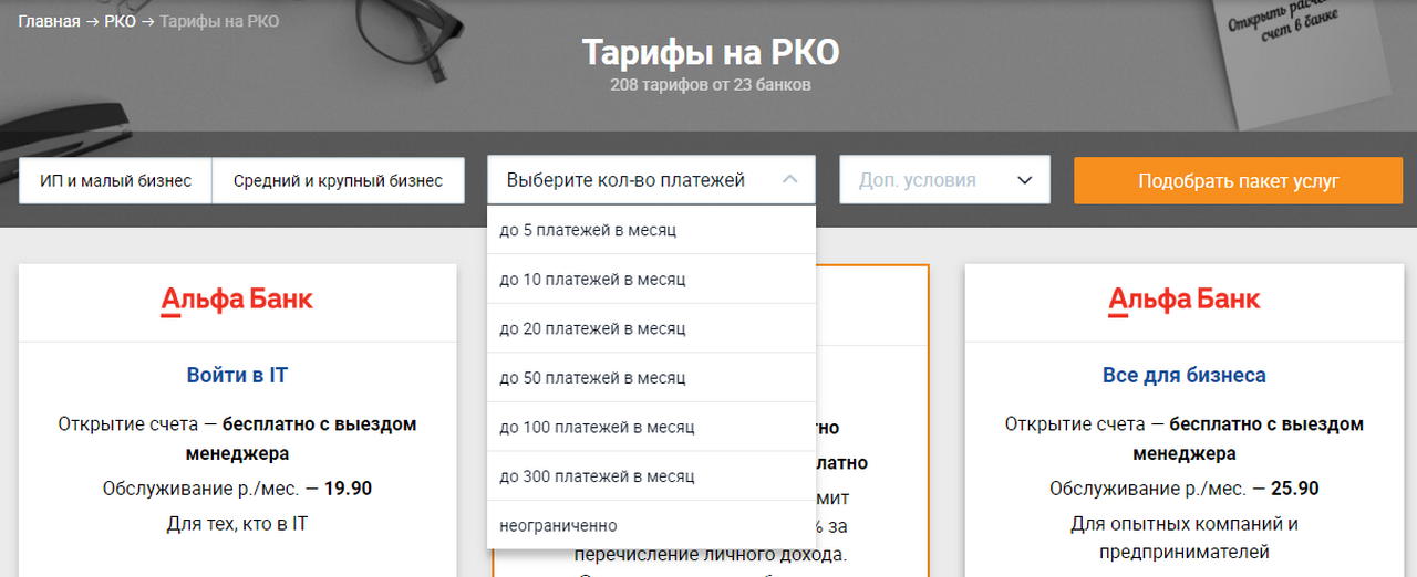 Подобрать пакет услуг можно на нашем сервисе: следует выбрать нужное количество платежей в рамках тарифа, а также необходимые дополнительные услуги и оставить заявку.