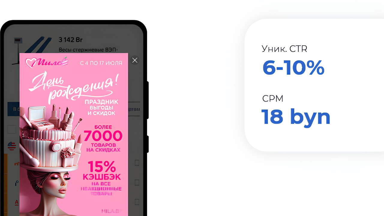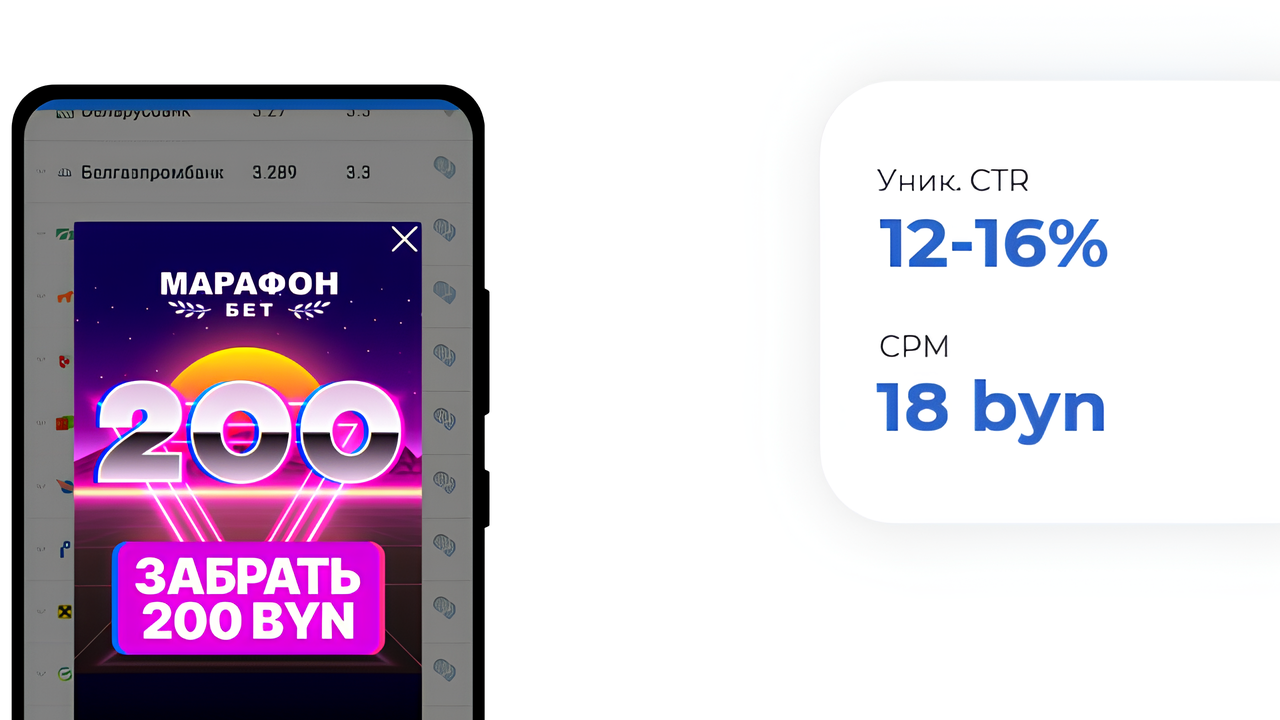 Рядом можно отметить креативы от Betera, Техно и БСБ Банка. Поскольку их предложения были ограничены по времени, то к ним применили более агрессивный формат ‒ фулскрин для продвижения. Коммуникация беттинга была ситуативна к чемпионату Европы по футболу, а банки запускали рекламные игры, стремясь привлечь как можно больше участников.
