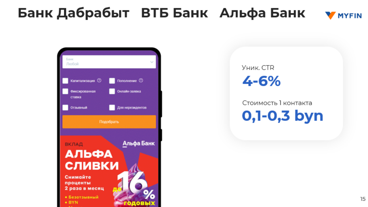 У всех компаний, которые рассматривались в презентации, были абсолютно разные маркетинговые бюджеты ‒ от скромных до внушительных. И Myfin.by, как одна из крупнейших площадок на белорусском рынке, помогла конвертировать их в целевые эффективные действия своих рекламодателей.