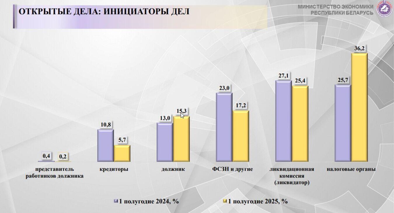 Департамент по санации и банкротству Минэкономики подвел итоги применения процедур несостоятельности и банкротства в Беларуси в первом полугодии 2025 года. Тенденции в этой сфере отражают данные «Бюллетеня о несостоятельности и банкротстве». Они таковы.