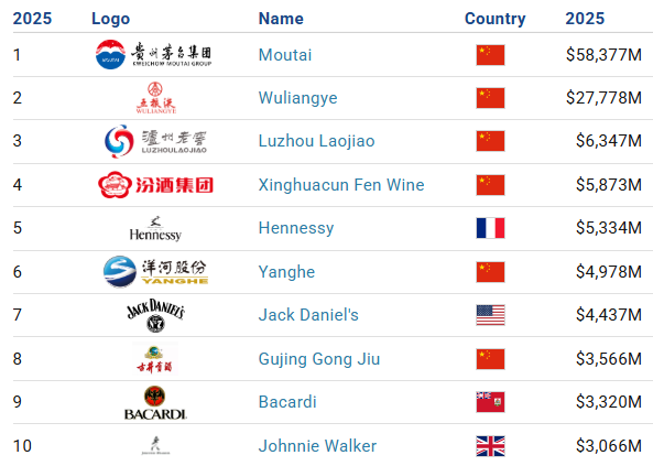 В списке значатся такие бренды КНР, как Moutai ($58,4 млрд), Wuliangye ($27,8 млрд), Luzhou Laojiao ($6,3 млрд), Xinghuacun Fen Wine ($5,9 млрд), Yanghe ($4,98 млрд), Gujing Gong Jiu ($3,6 млрд).