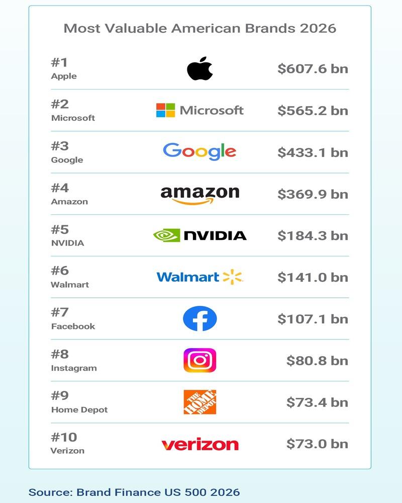 В 2026 году топ-10 самых дорогих брендов США выглядит так: