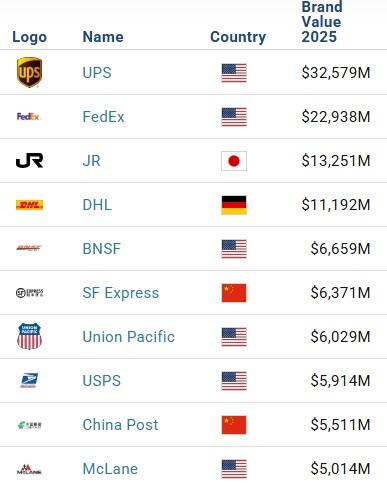 Помимо UPS, в первой десятке есть еще пять брендов США – FedEx, BNSF, Union Pacific, USPS и McLane.
