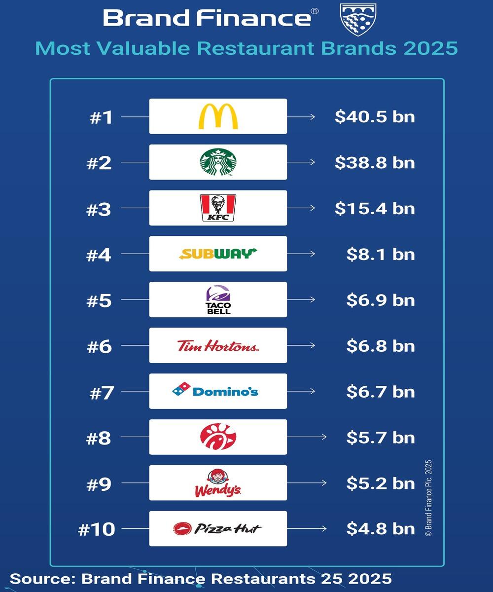 В топ-10 самых дорогих ресторанных брендов мира также вошли Subway, Taco Bell, Tim Hortons, Domino's Pizza, Chick-fil-A, Wendy's и Pizza Hut.