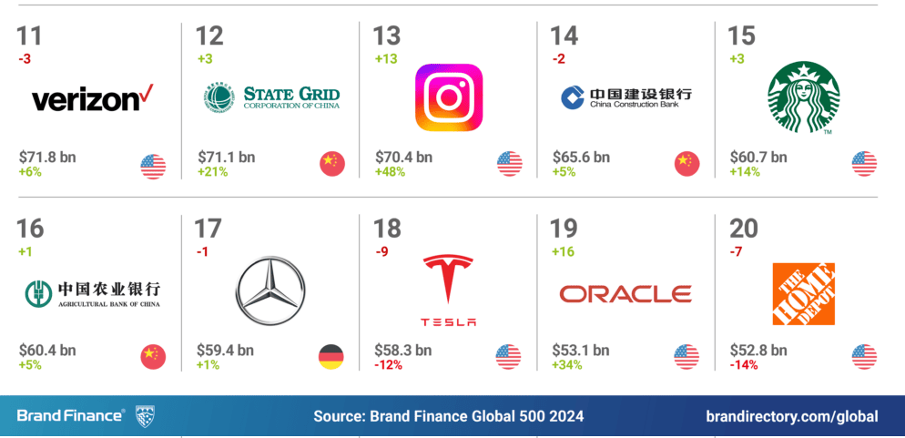 Во второй десятке отметились такие бренды, как Instagram ($70,4 млрд), Starbucks ($60,7 млрд), Mercedes-Benz ($59,4 млрд), Tesla ($58,3 млрд).