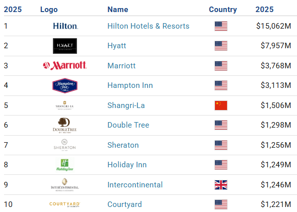 Hyatt ($7,96 млрд) в рейтинге Brand Finance Hotels 50 2025 занимает второе место благодаря росту номерного фонда, рекордному портфелю проектов и открытию крупных отелей в Азии и Южной Америке. Marriott ($3,77 млрд) после улучшения программ лояльности и модернизации услуг оказался на третьей позиции.