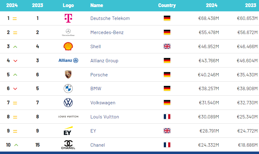 В топ-10 самых дорогих брендов Европы также вошли страховой бренд Allianz, автобренды Porsche, BMW и Volkswagen, модный люксовый бренд Louis Vuitton.