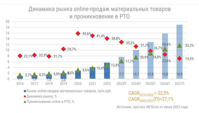 Каждый шестой рубль уже расходуется в онлайне, и мы понимаем, что этот тренд будет увеличиваться до 2027 года как минимум. Ожидаем, что к тому моменту доля e-commerce составит 32% от общего объема ритейла в России.
