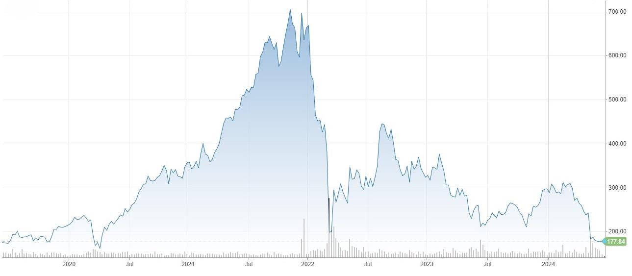 В целом постепенное снижение стоимости акций EPAM фиксировалось с марта, однако 9 мая случился резкий обвал: цена на бумаги упала с $249 до $181 всего за сутки.