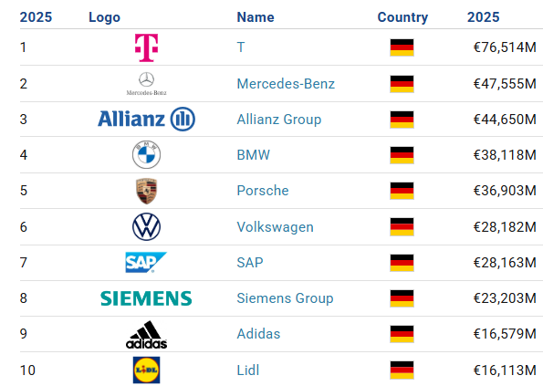 В топ-10 также вошли бренды Porsche, BMW, Volkswagen, SAP, Siemens, Adidas, Lidl.