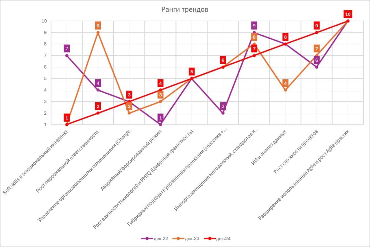 Так что тренд на рост персональной ответственности впервые ярко проявился в 2022 году, на волне геополитических потрясений. Тогда он занял 4-е место. В 2023 году ушел аж на 9-е место. А сейчас внезапно резко поднялся. С руководителей проектов стали строже спрашивать за результаты.