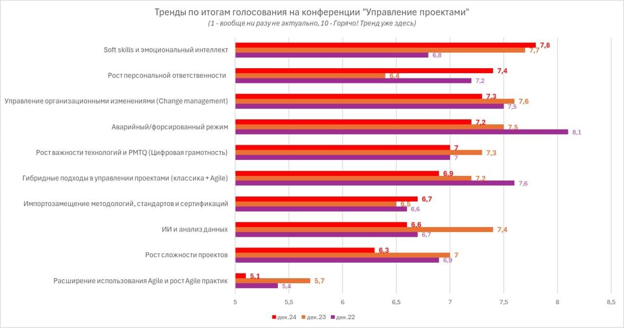 ‒ У меня как раз есть возможность поделиться с читателями Myfin.by самыми свежими данными. В декабре 2024 года в Москве прошла самая большая ежегодная независимая конференция по проектному управлению в России ‒ «Управление проектами». Это событие собирает практически всё региональное профессиональное сообщество, с которым вот уже несколько лет мы обсуждаем тренды в зале.