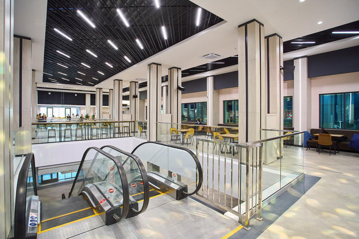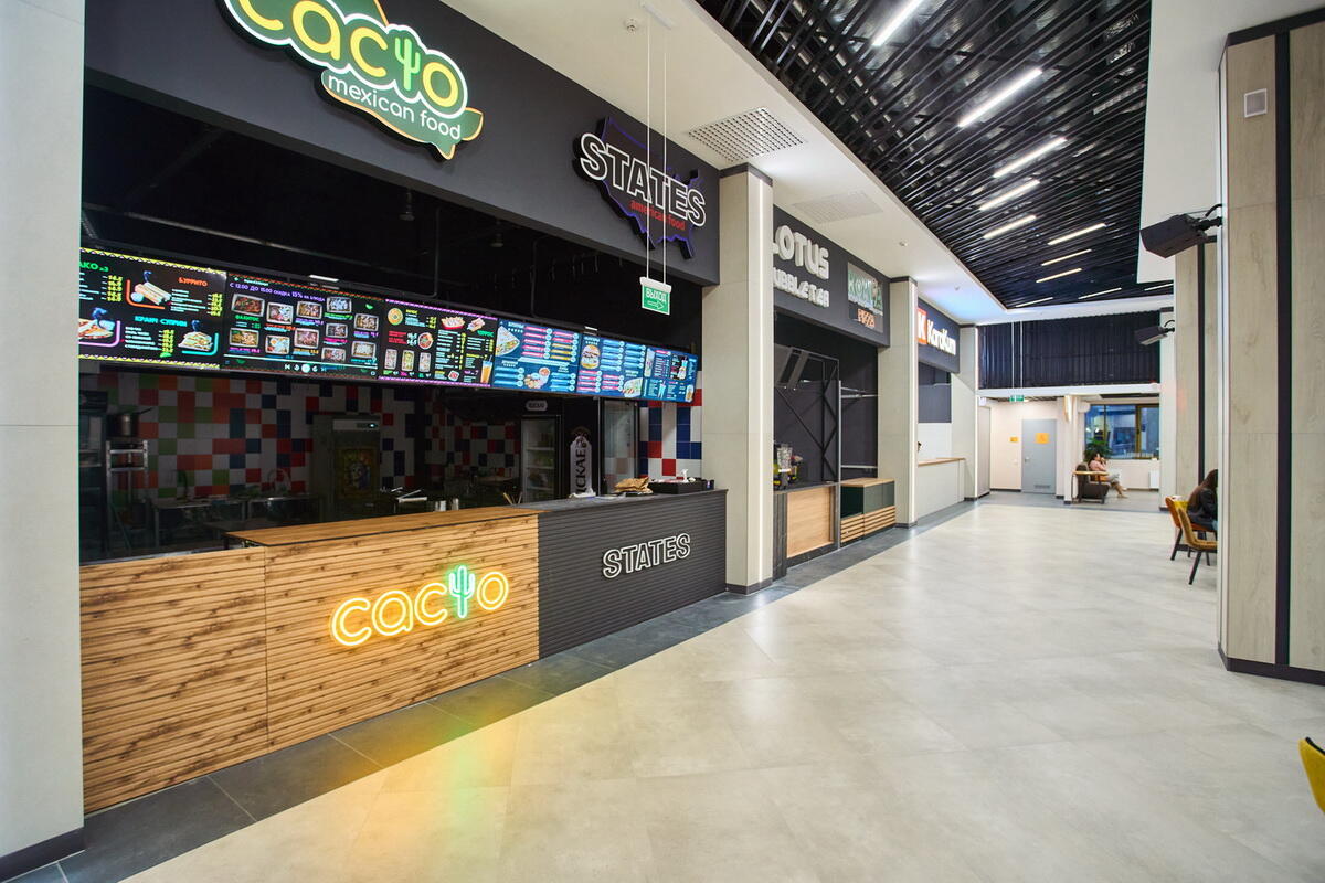 Третий этаж новой галереи выполнили сквозным, он позволяет пройти через комплекс. Там разместится фудкорт, объединяющий около десяти точек общепита. В меню представлены бургеры, пицца, туркменские кебабы, мексиканские закуски, тайские супы, шаурма, узбекский плов, а также блюда домашней кухни. Общее количество посадочных мест на фудкорте составит около 200. Для трансляций установлен большой экран.