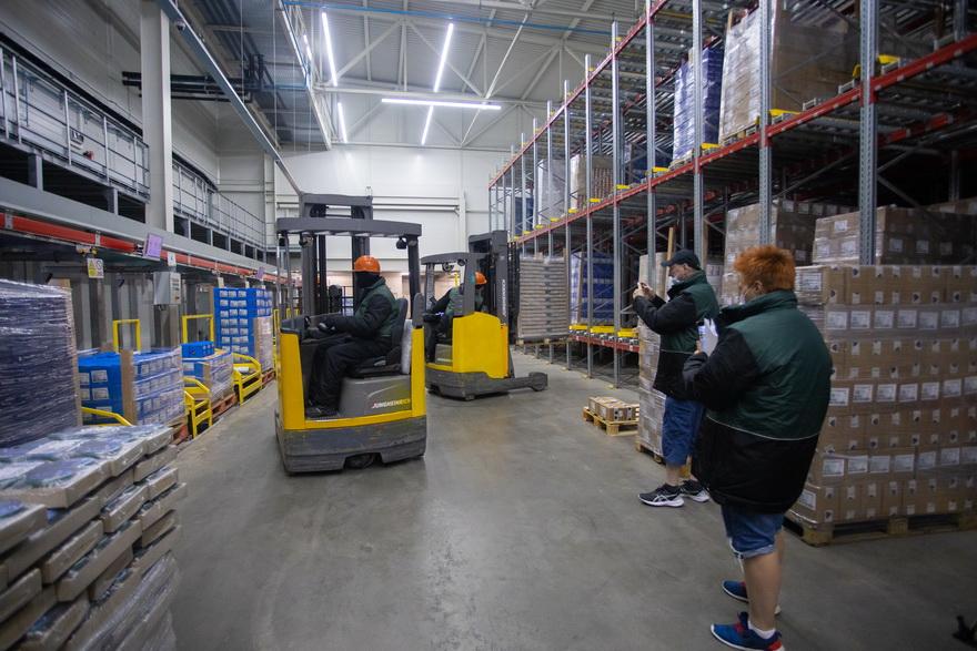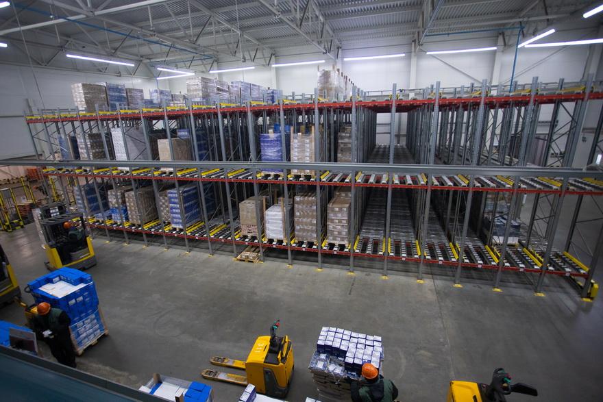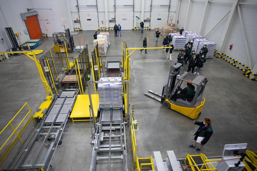 Большинство работ выполняет автоматика. Робот-конвейер доставляет продукты на нужную палету и достает их оттуда во время отгрузки. Система сама определяет свободные места для хранения или комплектации товаров.