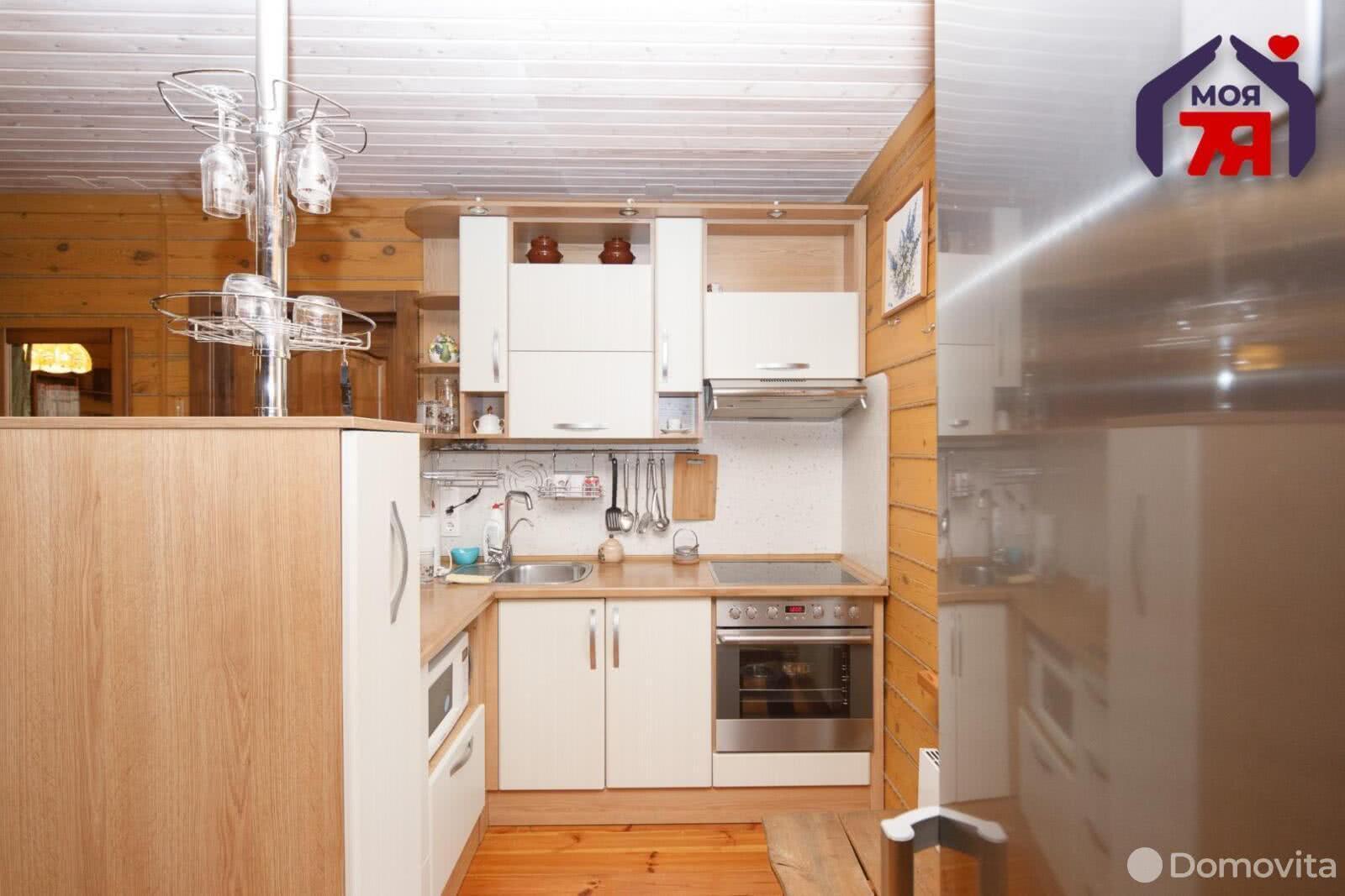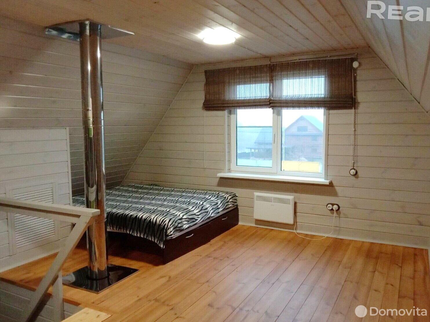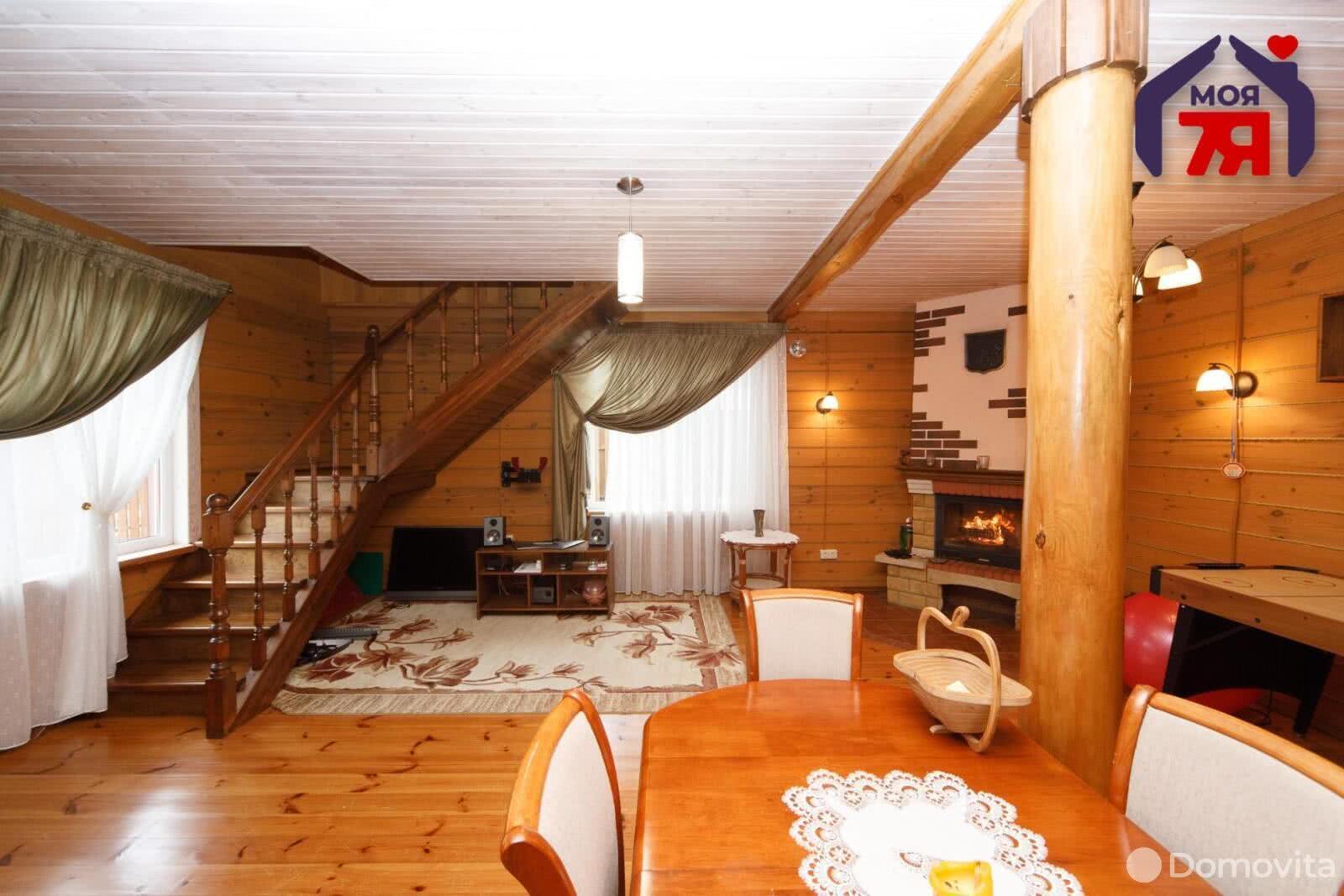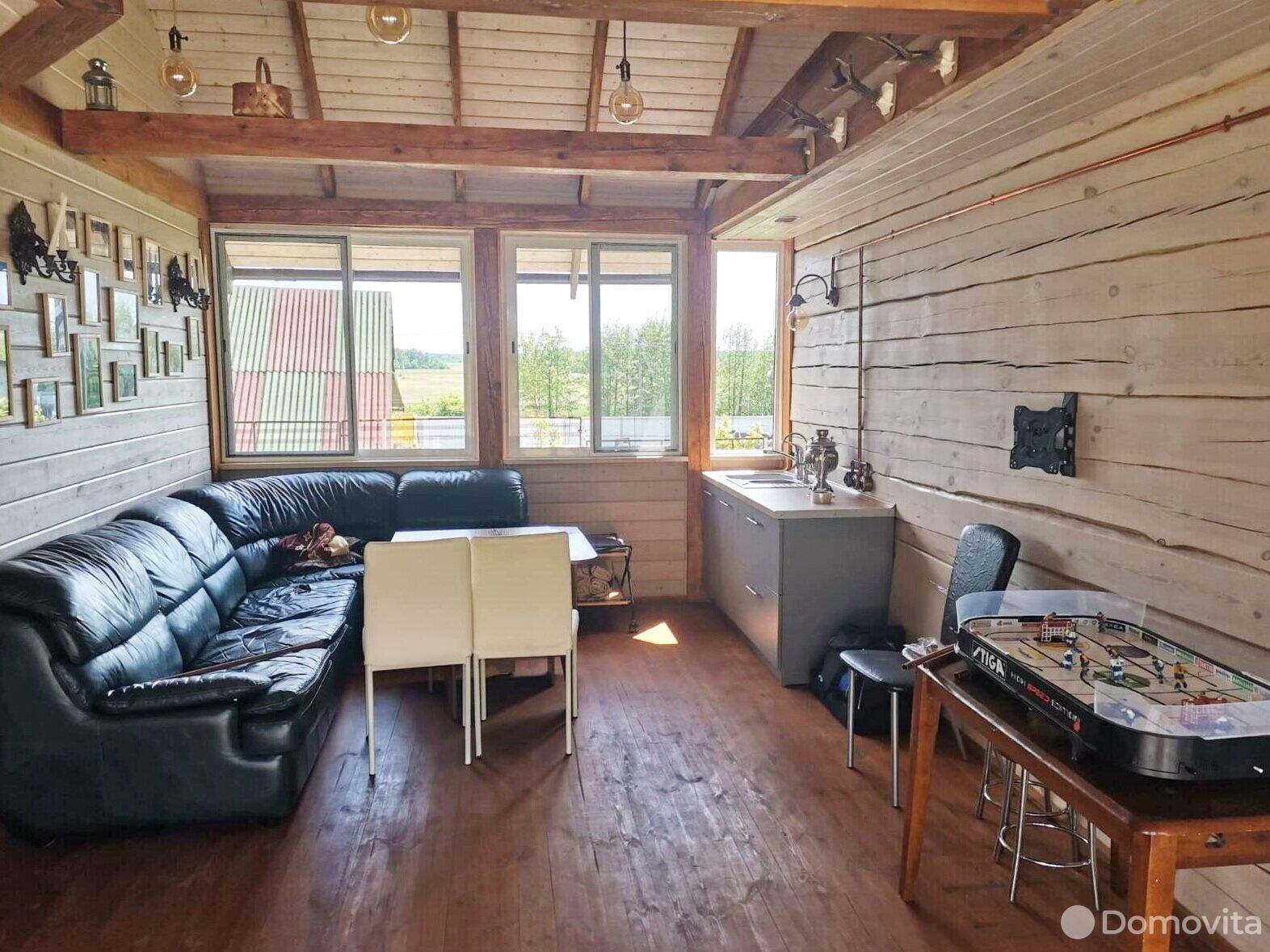 Двухэтажный коттедж в 18 километрах от Минска, построенный в 2012 году. Дом выполнен из бревен, общая площадь составляет 96 квадратных метров. На первом этаже совмещенный санузел, кухня-гостиная с массивным камином с системой нагнетания горячего воздуха и разводкой по комнатам. На втором этаже 3 изолированные спальни, кладовая и открытый балкон. В дом заведена вода из колодца (а еще разведена по участку в 6 точках), канализация – трехсекционный септик. На участке в 10 соток построена беседка с печью и тандыром, помещение для хозинвентаря и баня.