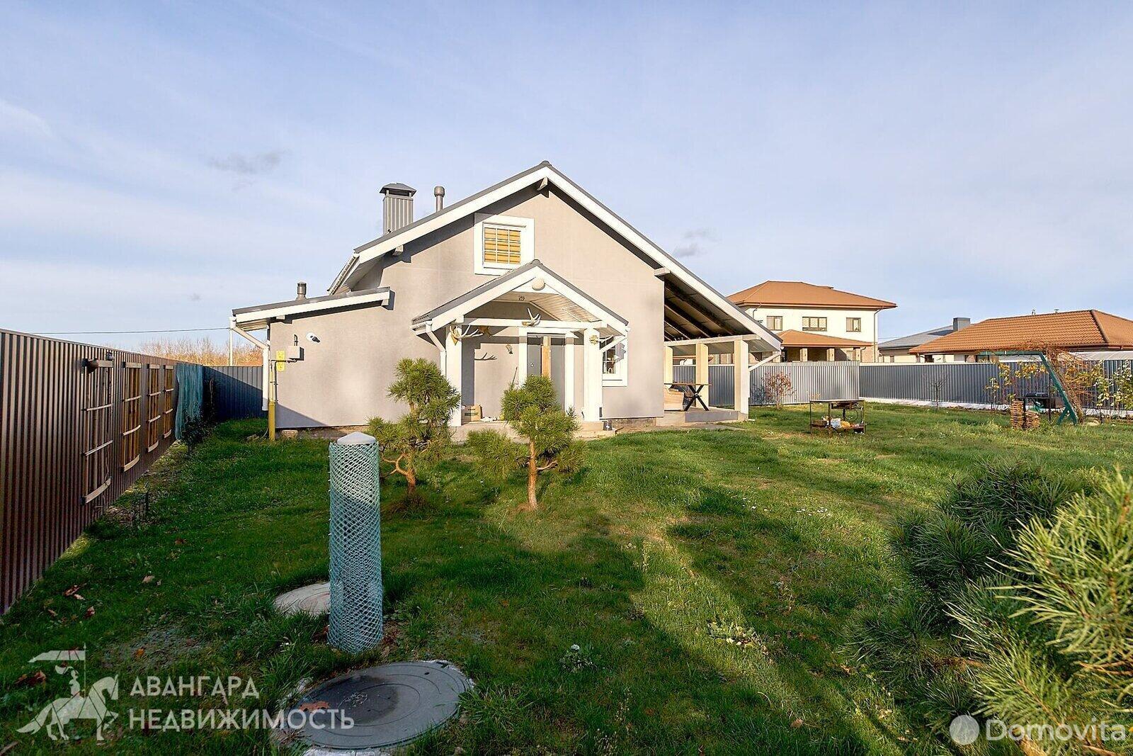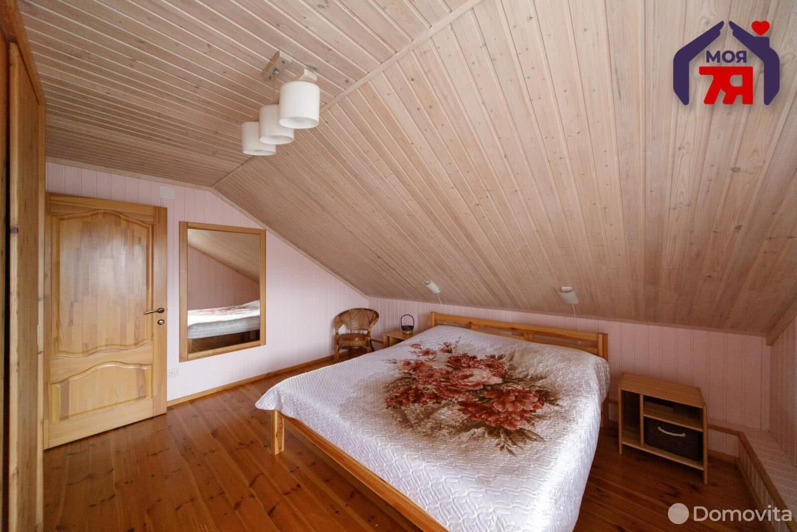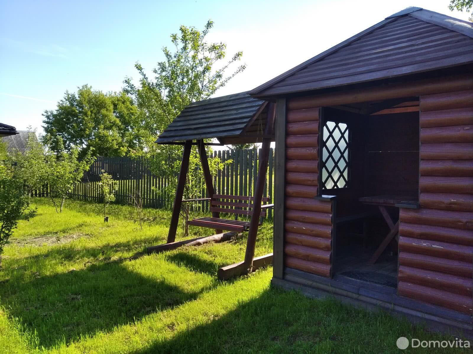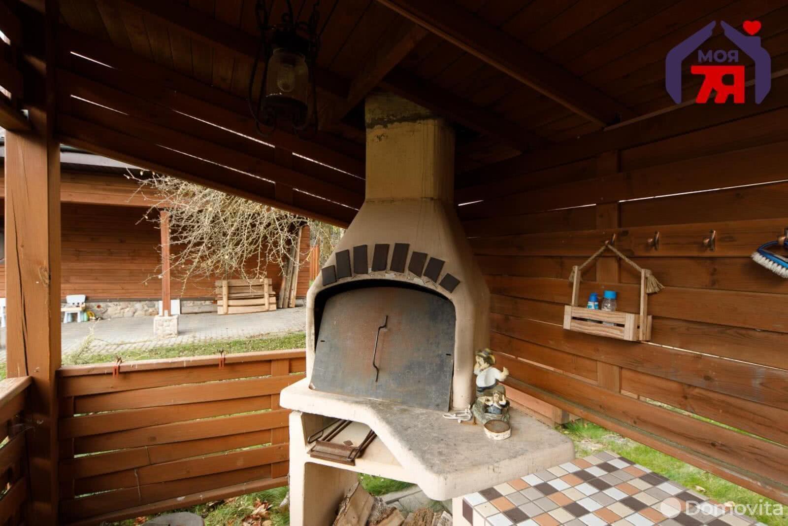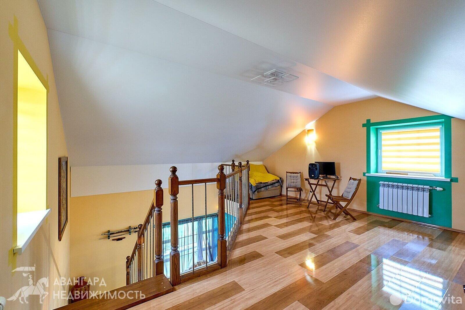 Двухэтажный коттедж в 18 километрах от Минска, построенный в 2012 году. Дом выполнен из бревен, общая площадь составляет 96 квадратных метров. На первом этаже совмещенный санузел, кухня-гостиная с массивным камином с системой нагнетания горячего воздуха и разводкой по комнатам. На втором этаже 3 изолированные спальни, кладовая и открытый балкон. В дом заведена вода из колодца (а еще разведена по участку в 6 точках), канализация – трехсекционный септик. На участке в 10 соток построена беседка с печью и тандыром, помещение для хозинвентаря и баня.