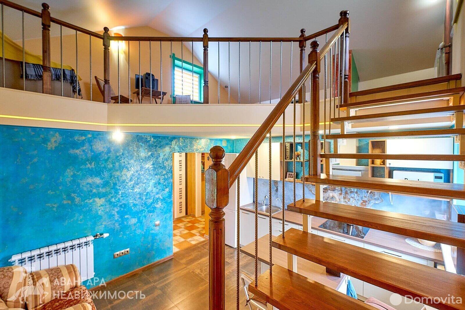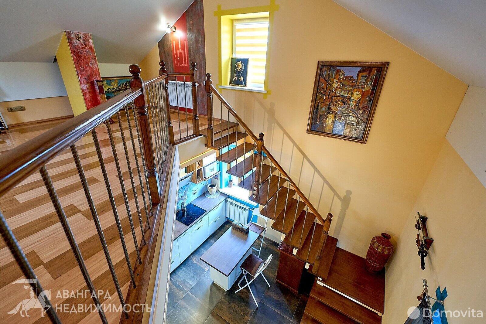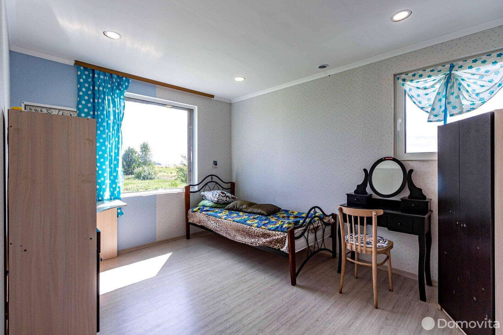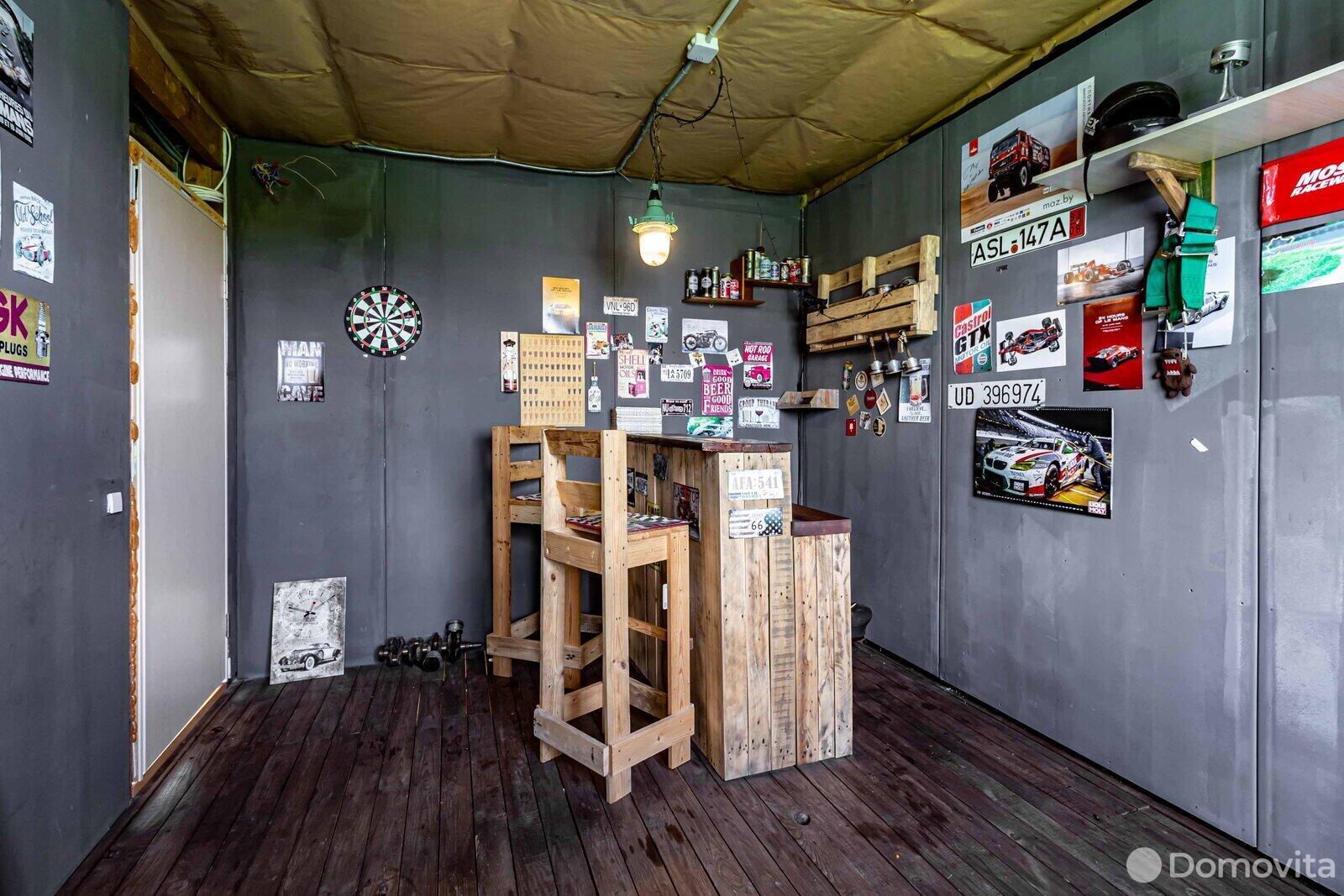 Двухэтажный коттедж в 18 километрах от Минска, построенный в 2012 году. Дом выполнен из бревен, общая площадь составляет 96 квадратных метров. На первом этаже совмещенный санузел, кухня-гостиная с массивным камином с системой нагнетания горячего воздуха и разводкой по комнатам. На втором этаже 3 изолированные спальни, кладовая и открытый балкон. В дом заведена вода из колодца (а еще разведена по участку в 6 точках), канализация – трехсекционный септик. На участке в 10 соток построена беседка с печью и тандыром, помещение для хозинвентаря и баня.