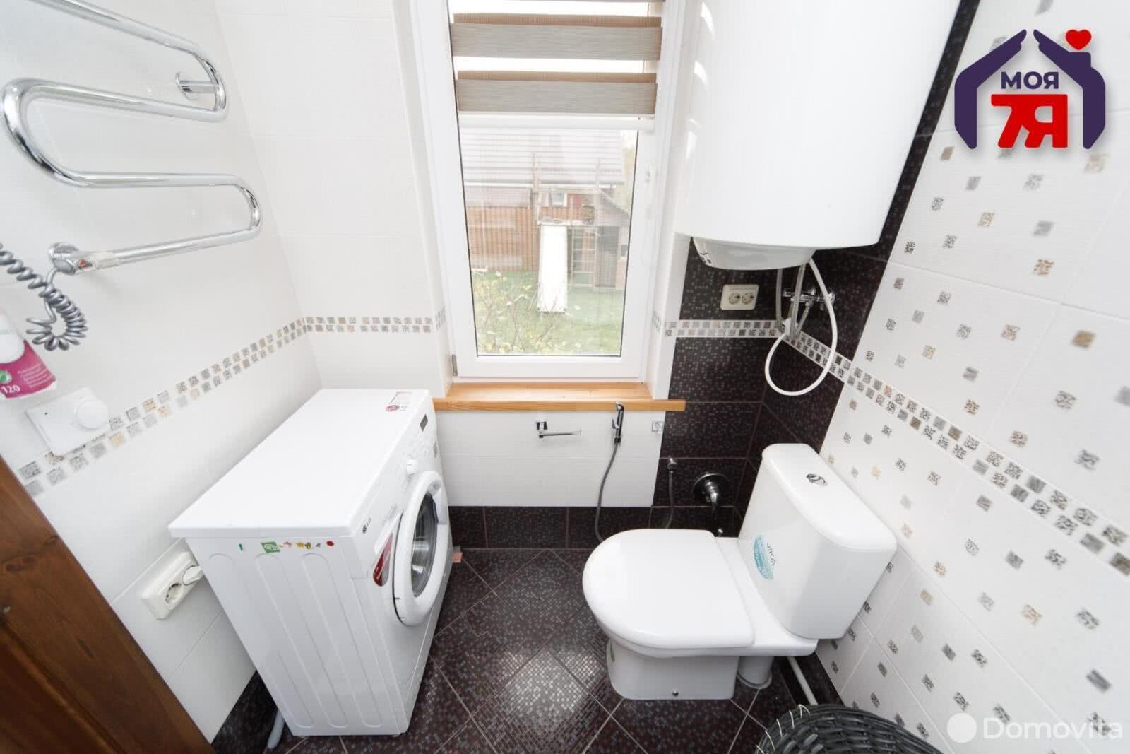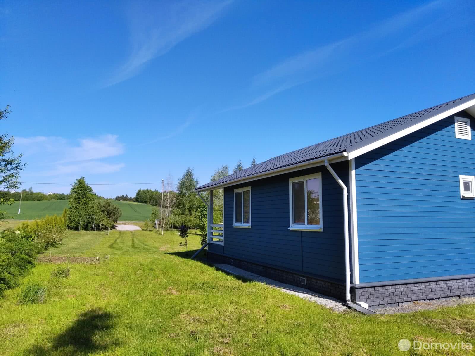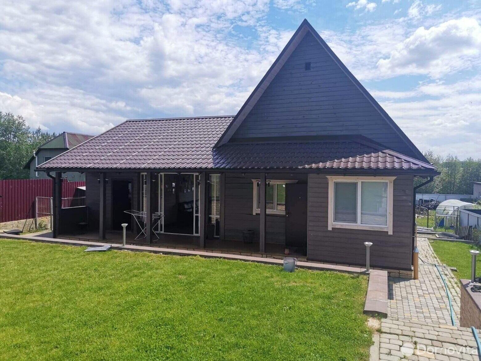 Одноэтажный коттедж в 11 километрах от Минска. Но добраться в город без машины можно только на автобусе или маршрутке. Дом каркасный, построен в 2019 году. Общая площадь составляет 64 квадрата, внутри кухня-гостиная и две жилые комнаты. Коттедж утеплили, в дом провели воду из колодца, а также устроили местную канализацию. На территории в 14 соток разбит небольшой сад, есть беседка и качели.