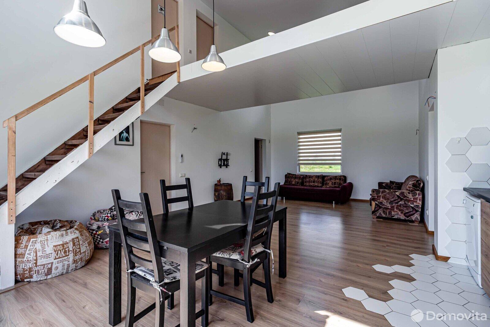 Двухэтажный дом в 15 километрах от Минска и в 10 минутах ходьбы от водохранилища Вяча. Дом 2019 года, общая площадь составляет 64 квадратных метра. В доме нет изолированных комнат. На первом этаже устроили кухню-гостиную со вторым светом, а второй уровень – с балконом, который выходит на эту кухню-гостиную. В доме есть терраса, раздельный санузел и помещение под баню. Участок 9,5 сотки.