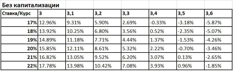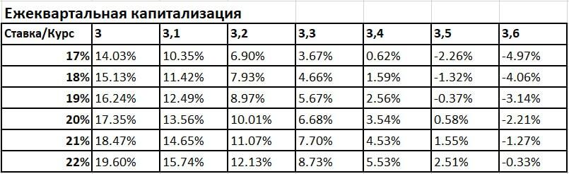 - Если курс достигнет 3,4, доходность снизится до 3,87% в USD.