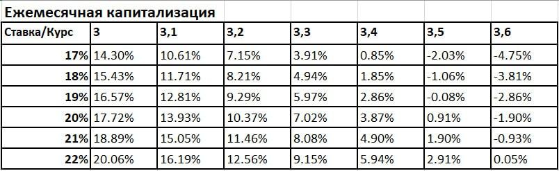 Пример: Доходность 7,02% из нашей таблицы эквивалентна валютному вкладу со ставкой примерно 6,8%, если там тоже есть ежемесячная капитализация.