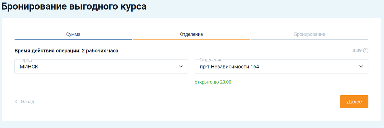 Шаг 2. Выбираем удобное отделение МТБанка, где вы планируете провести обмен валют. Помните, что курс будет зафиксирован на 2 часа с момента оставления заявки. Также в отделении банка вас будет ждать нужная сумма валюты.