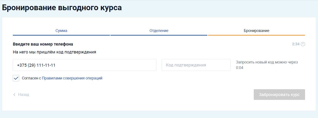 Шаг 3. Указываем номер телефона. На этот номер придет код для подтверждения номера телефона. После чего придет код подтверждения операции. Код подтверждения операции (не путаем его с кодом подтверждения телдефона) нужно будет сообщить сотруднику отделения банка, который вы выбрали для обмена валют.