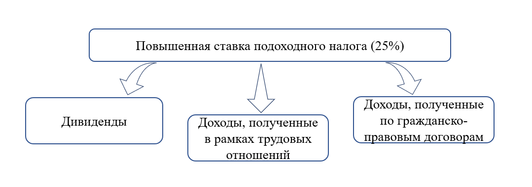 В этом случае доходы, полученные в рамках трудовых отношений, облагаются повышенной ставкой подоходного налога. Вознаграждения членам совета директоров или наблюдательного совета, выплачиваемые на основании решений органов управления компании и устава, не считаются доходом, облагаемым налогом на «сверхдоход» по ставке 25%.