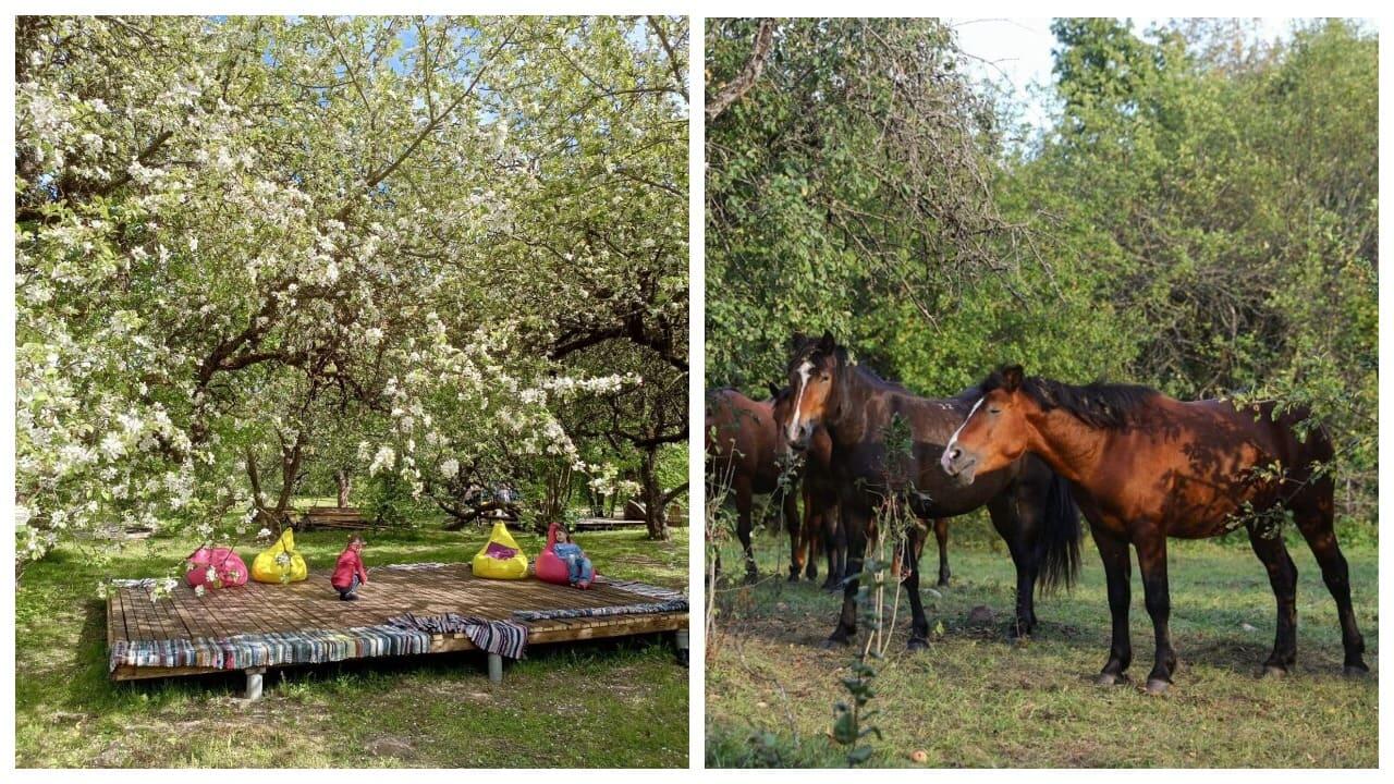 Именно в начале мая сад особенно красив: деревья в полном цвету, воздух пахнет весной, а фото получаются без фильтров. Еще один бесспорный бонус – лошади.