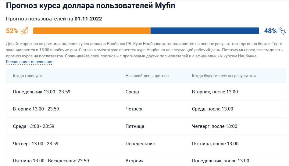 На странице с курсами валют (под таблицей с курсами банков) можно делать прогноз на рост или падение курса доллара. Приводится также и расписание голосования.