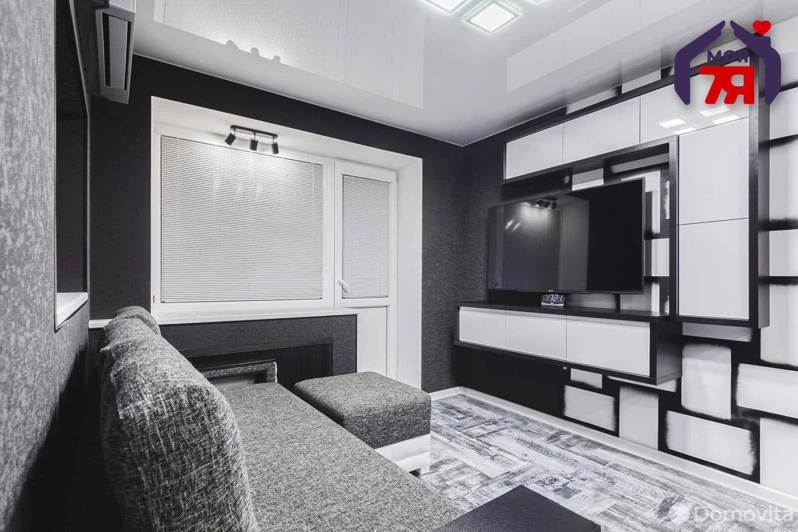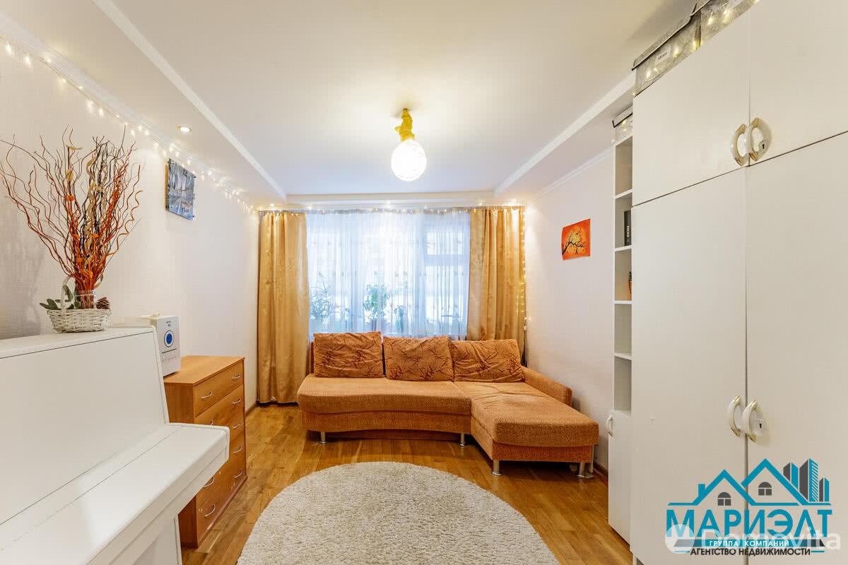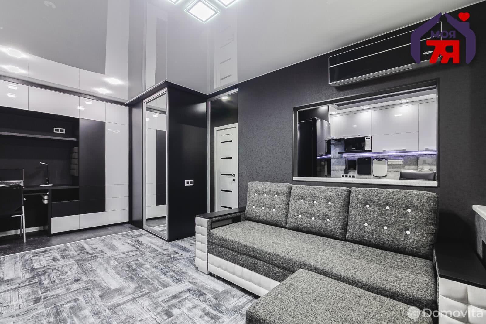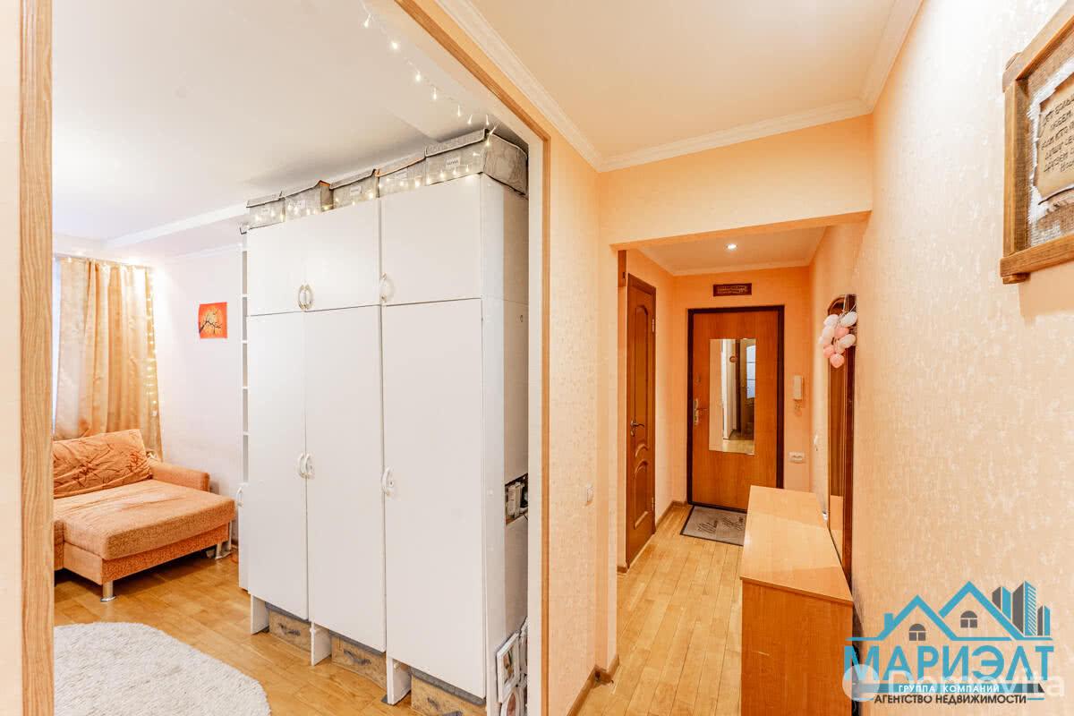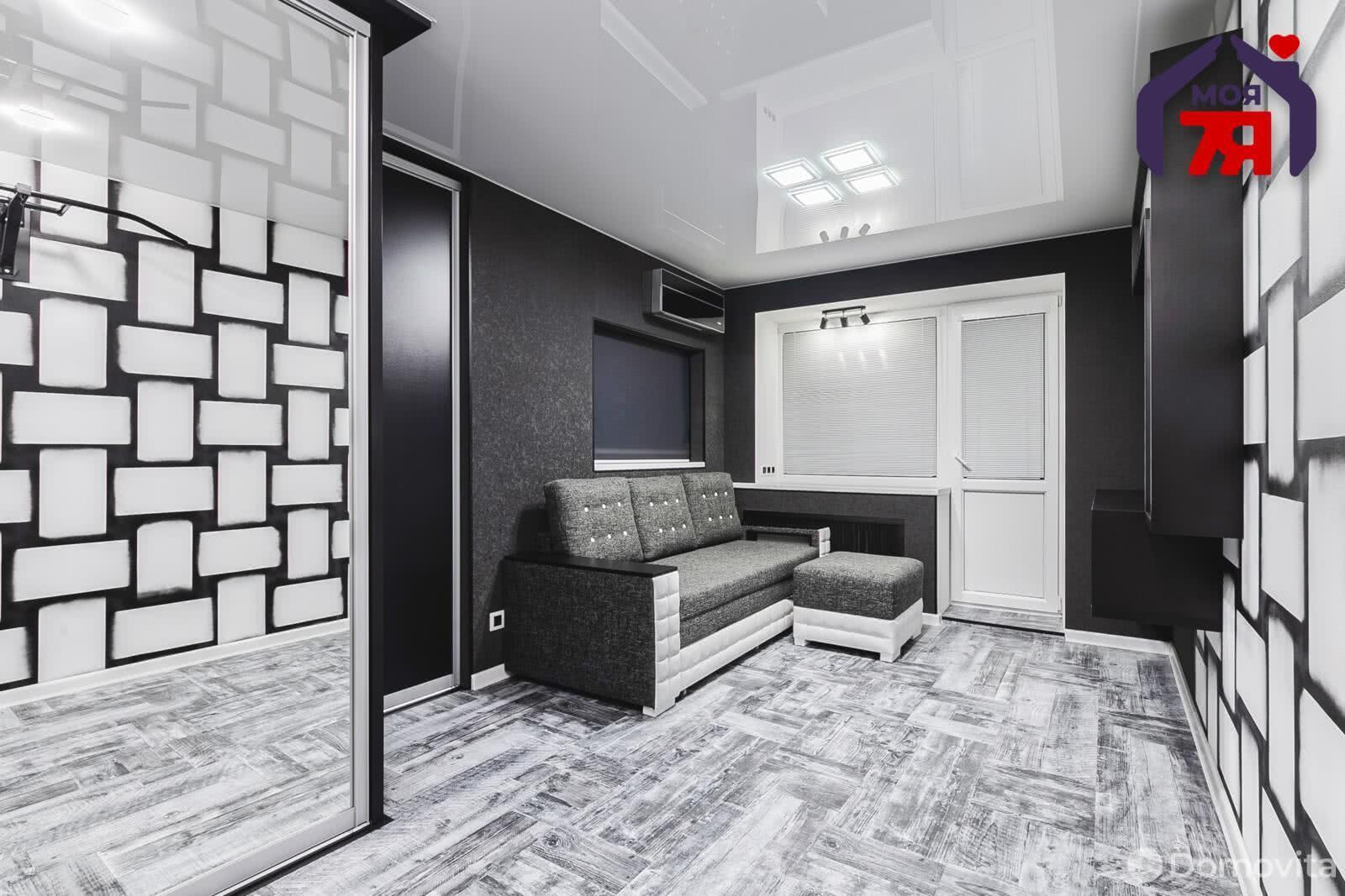 Небольшая квартира площадью 31 кв.м в панельном доме 1963 года постройки. Находится возле трамвайных путей на стыке улицы Якуба Коласа и Логойского тракта, до метро 15 минут на общественном транспорте. Дом после капремонта в 2010 году. В гостиной два окна, есть балкон. Ремонт выглядит прилично, в комнате светлая отделка, в санузле лежит плитка.