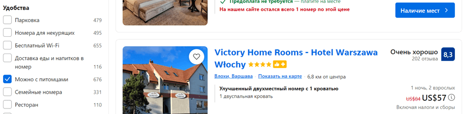 Популярные сервисы по аренде, например Booking.com или Airbnb, имеют фильтр «Можно с питомцами» ‒ так можно выбрать только пет-френдли жилье. Будьте внимательны ‒ на Booking.com в таких отелях и апартаментах может стоять примечание «за дополнительную оплату». На Airbnb тоже часто в примечаниях можно найти эту информацию, а также ограничения по виду питомцев (например, нельзя с большими собаками, но можно с маленькими).