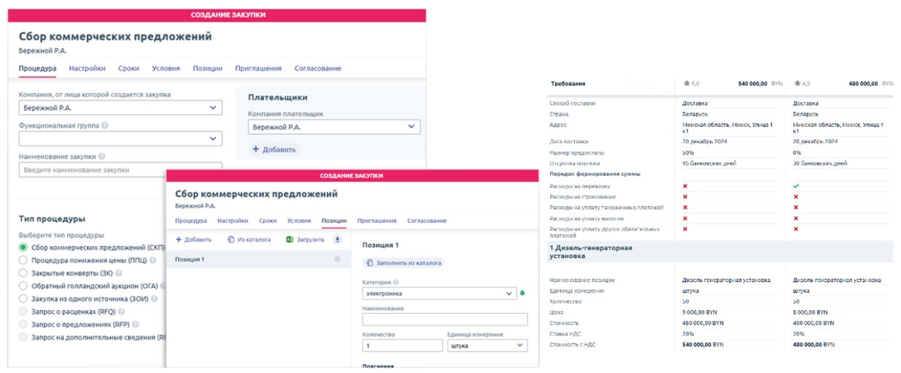 - Позволяет проводить конкурентные закупки с минимальным участием менеджера