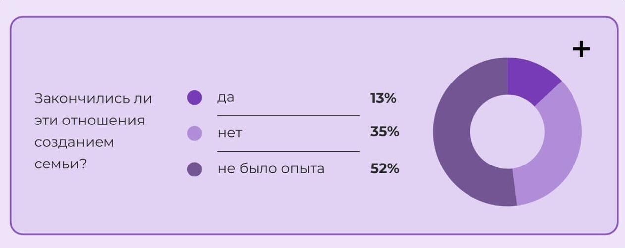 13% служебных романов заканчиваются созданием семьи, 35% респондентов поделились, что романы не заканчиваются новой ячейкой общества.