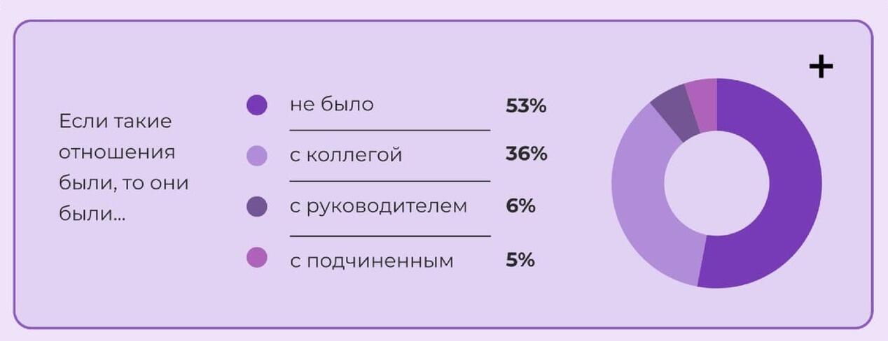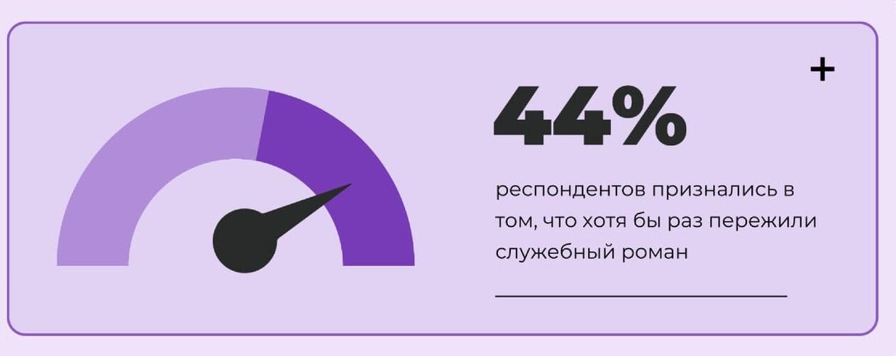 В результате опроса выяснилось, что у 44% респондентов был служебный роман хотя бы раз в жизни. При этом 36% встречались с коллегами, 5% — с подчиненными, а 6% — с руководителем.