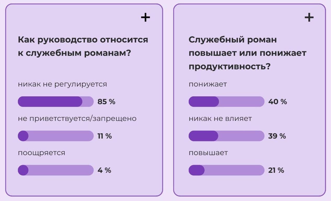 Мнения респондентов разделились. Многие уверены, что личные отношения на работе могут снизить продуктивность — 40% респондентов поддерживают это мнение. 39% считают, что служебный роман никак не влияет на эффективность работы. А вот 21% считает, что такие отношения могут повысить продуктивность на рабочем месте