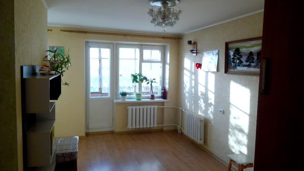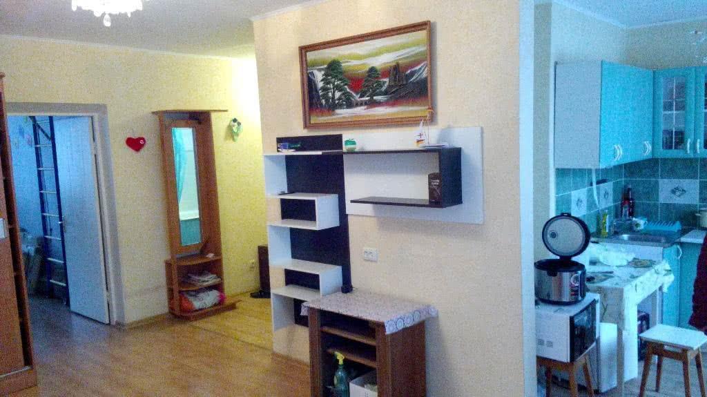 Квартира на ул. Комсомольской за $38,5 тыс. – это однушка площадью 34 кв.м в панельном доме 1990 года постройки. В объявлении сказано, что в квартире установлены пластиковые стеклопакеты, металлическая дверь, натяжные потолки, а на полу постелен линолеум. В квартире оставляют кухонный гарнитур и шкаф-купе.