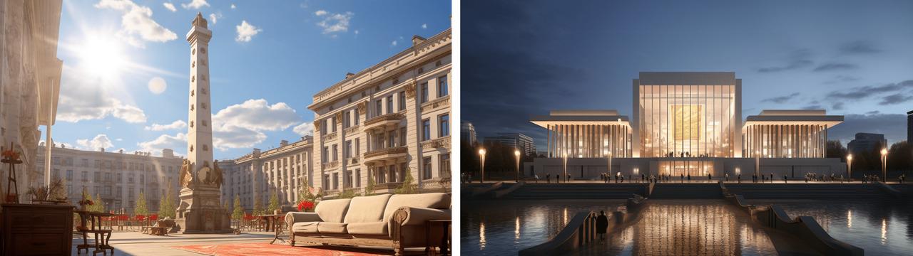 После выбора изображения, мы переходили к созданию нужного фона. На нем было решено разместить город страны, к которой принадлежит валюта, чтобы картинка была понятна даже без подписи. Многие города Midjourney создавал без труда, однако с некоторыми возникали проблемы. Например, Минск, Варшаву и Киев, ИИ не знал, он выдавал абсолютно непохожие иллюстрации абстрактных мест. Мы пробовали делать запрос на конкретные достопримечательности этих городов, но это не помогло добиться необходимого результата.